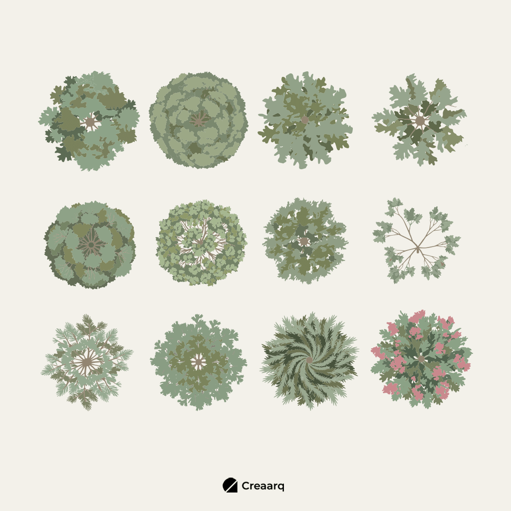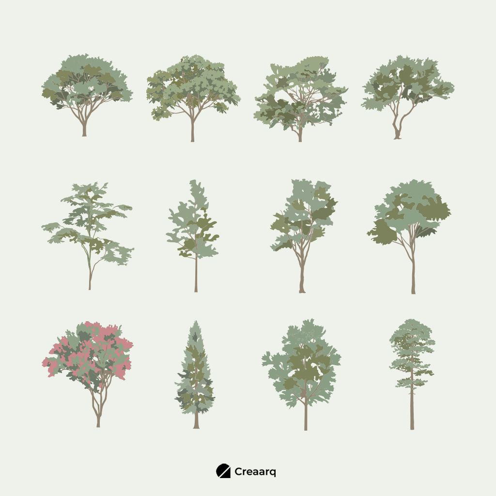 El Pack de Árboles Ilustrados de Creaarq es una colección versátil de árboles ilustrados en vista en planta y vista en elevación, diseñada para elevar la calidad visual de tus proyectos arquitectónicos y gráficos.
